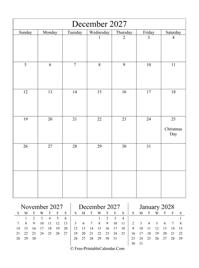 2027 Calendar December (Portrait Layout) - This calendar was designed in vertical layout included three mini calendar at bottom. It's also available in Word format which you can easy to edit and print.