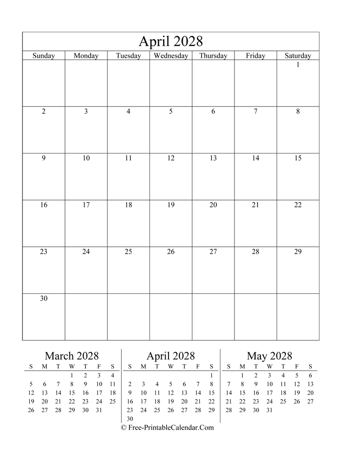 2028 Calendar April (Portrait Layout) - This calendar was designed in vertical layout included three mini calendar at bottom. It's also available in Word format which you can easy to edit and print.