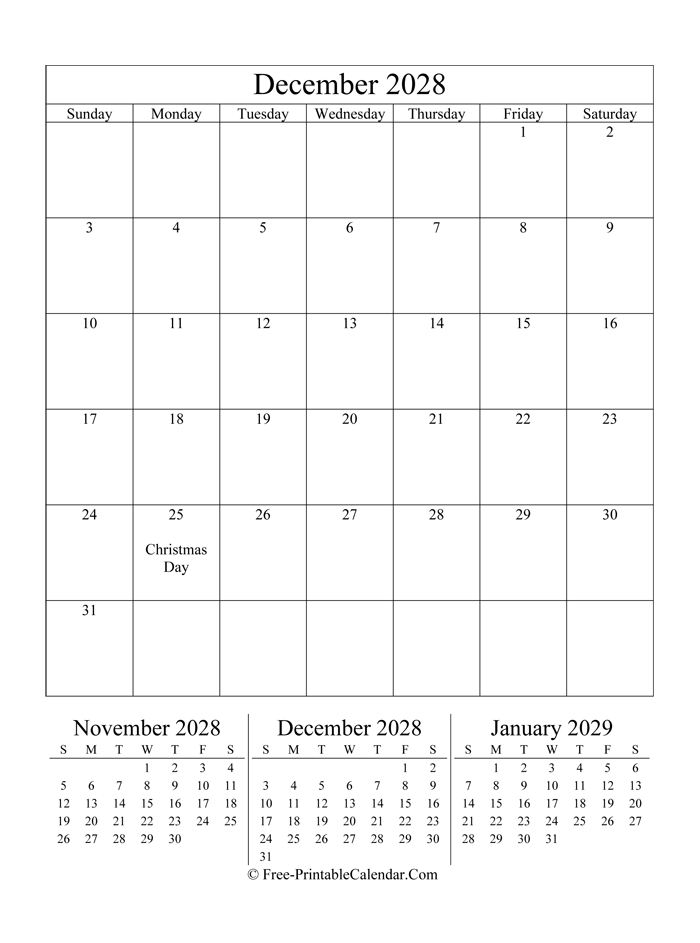 2028 Calendar December (Portrait Layout) - This calendar was designed in vertical layout included three mini calendar at bottom. It's also available in Word format which you can easy to edit and print.