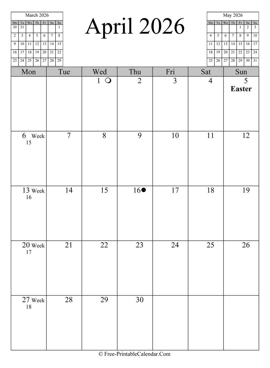 April 2026 Calendar (Vertical Layout) - A portrait calendar for april which included weeknumber, full moon, new moon date and two mini calendars at header. You can download this vertical calendar in Word, PDF or PNG format.