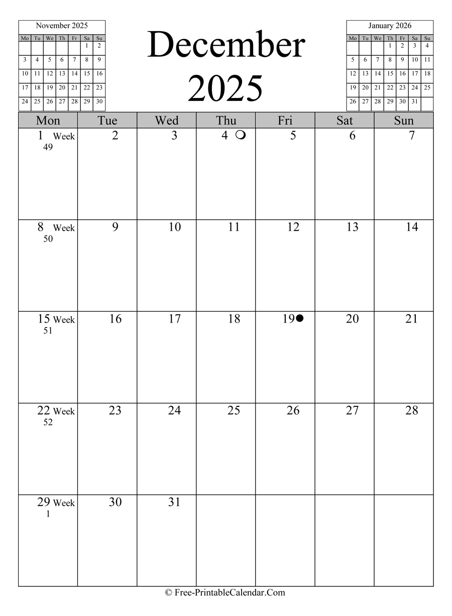 December 2025 Calendar (Vertical Layout) - A portrait calendar for december which included weeknumber, full moon, new moon date and two mini calendars at header. You can download this vertical calendar in Word, PDF or PNG format.