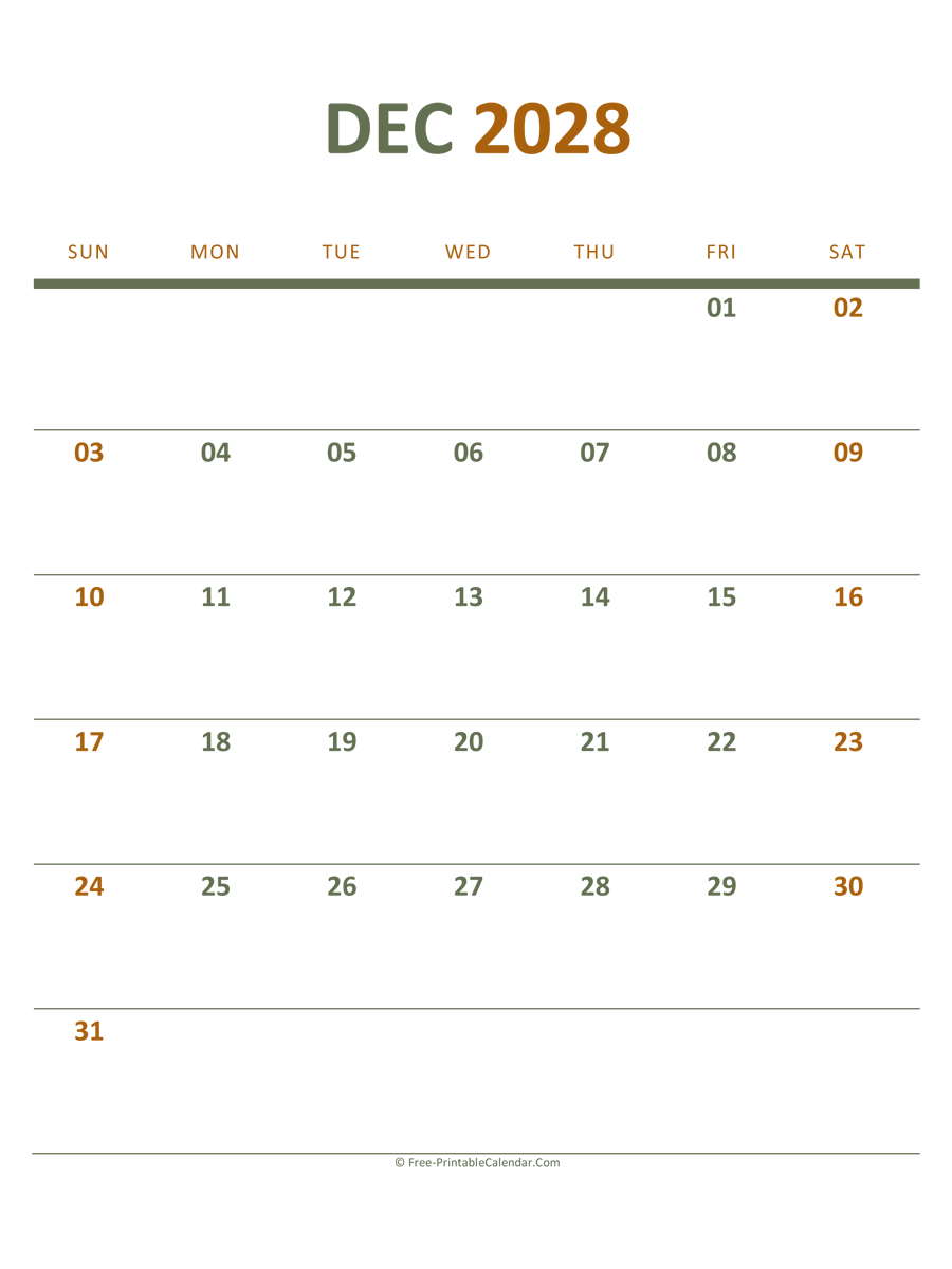 December 2028 Printable Calendar - Print the last month of the year 2028 with major religious holidays such as Christmas day, Boxing Day, New Year's Eve... Download and add your important events then print it your self.