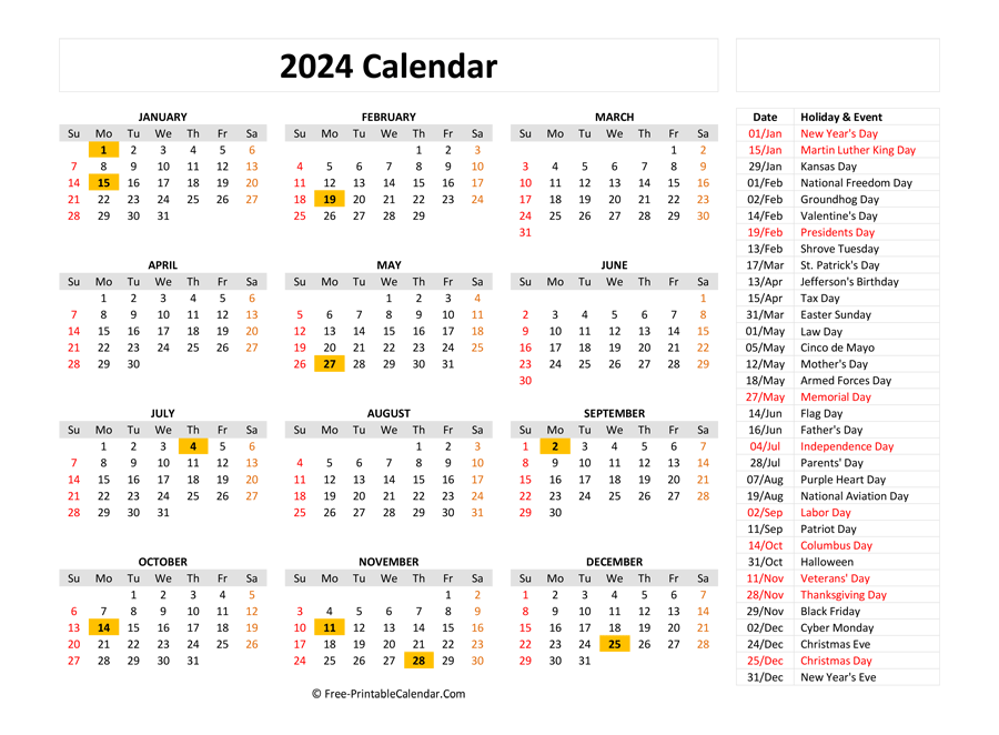 This calendar is free for personal use only and if you think it is useful please link to us. Just copy & paste the following code to your site or blog to share Free Printable Calendar 2024 With Holidays, weeks start on Sunday.