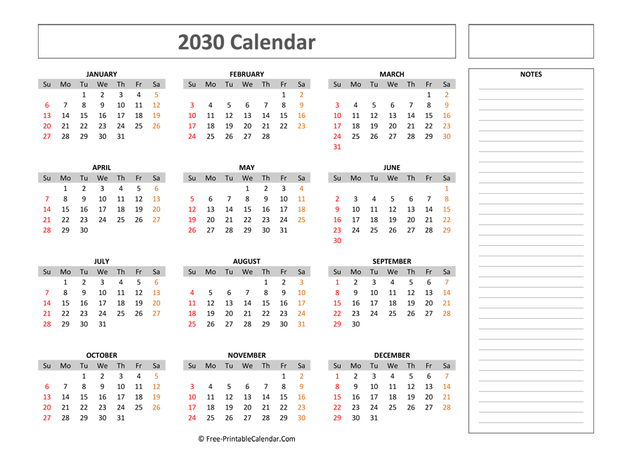 This calendar is free for personal use only and if you think it is useful please link to us. Just copy & paste the following code to your site or blog to share Free Printable Calendar 2030 With Notes, weeks start on Sunday.