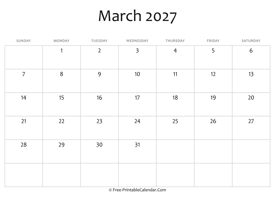 Editable 2027 March Calendar - A blank calendar for march 2027 in horizontal layout. Download, print and use it at home, office or school for free.