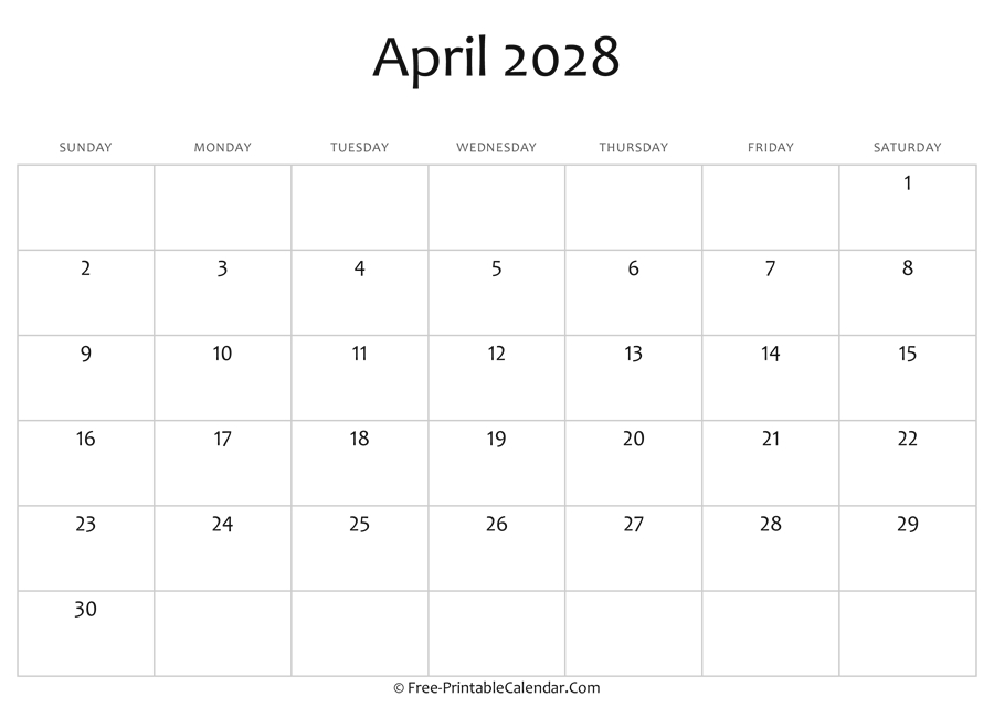 Editable 2028 April Calendar - A blank calendar for april 2028 in horizontal layout. Download, print and use it at home, office or school for free.