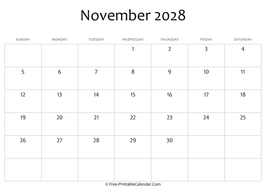 Editable 2028 November Calendar - A blank calendar for november 2028 in horizontal layout. Download, print and use it at home, office or school for free.