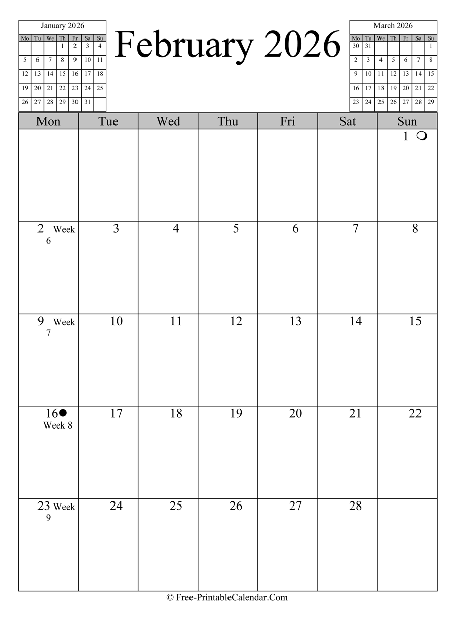 February 2026 Calendar (Vertical Layout) - A portrait calendar for february which included weeknumber, full moon, new moon date and two mini calendars at header. You can download this vertical calendar in Word, PDF or PNG format.