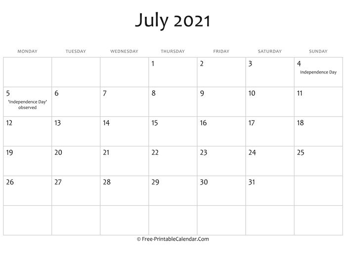 July 2021 Calendar Printable with Holidays - A simple monthly calendar for july with weeks start on Monday and us federal holidays.