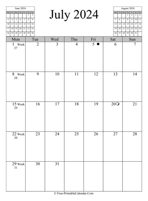July 2024 Calendar (Horizontal Layout) - A landscape calendar for july which included weeknumber, full moon, new moon date and two mini calendars at header. You can download this calendar in Word, PDF or PNG format.
