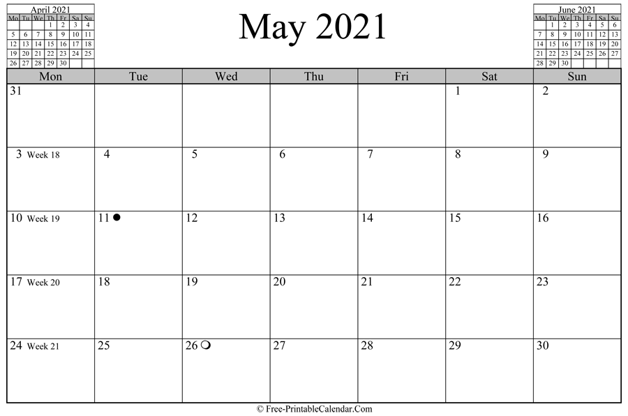 May 2021 Calendar (Horizontal Layout) - A landscape calendar for may which included weeknumber, full moon, new moon date and two mini calendars at header. You can download this calendar in Word, PDF or PNG format.