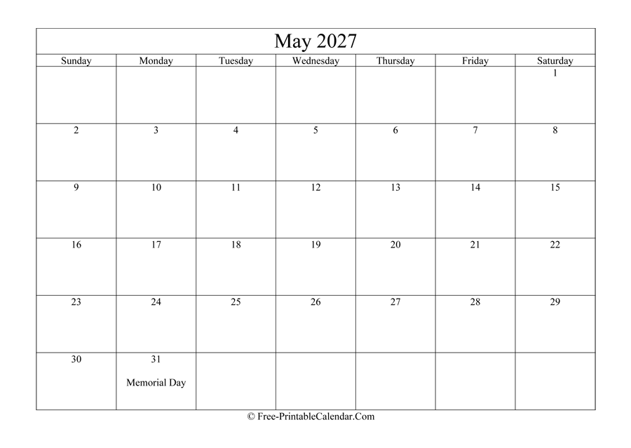 This calendar is free for personal use only and if you think it is useful please link to us. Just copy & paste the following code to your site or blog to share May 2027 Calendar Printable with Holidays.