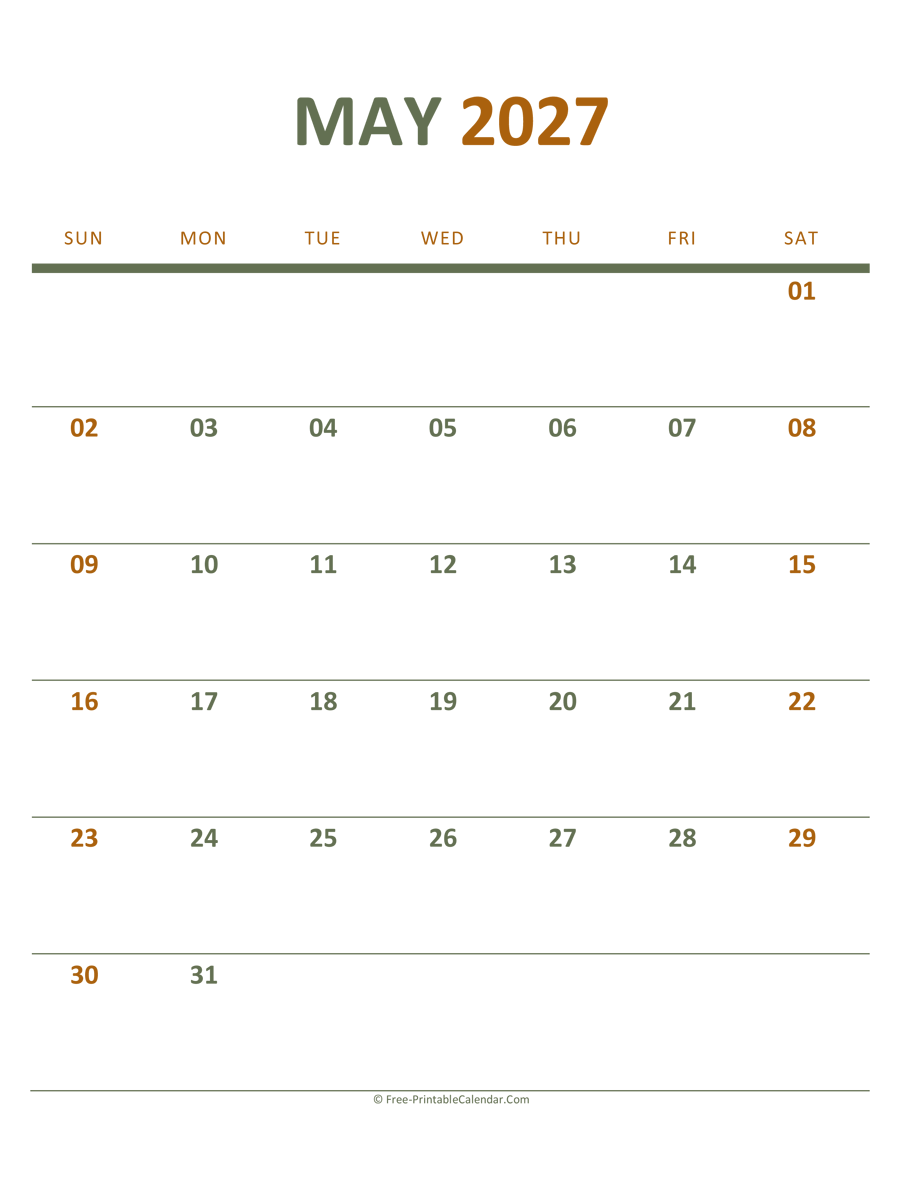 May 2027 Printable Calendar - Another vertical calendar for may 2027. Free download and print an editable calendar with many formats: .docx, pdf, png. Here is some special holidays for May if you want to know: Mother's Day, Memorial Day.
