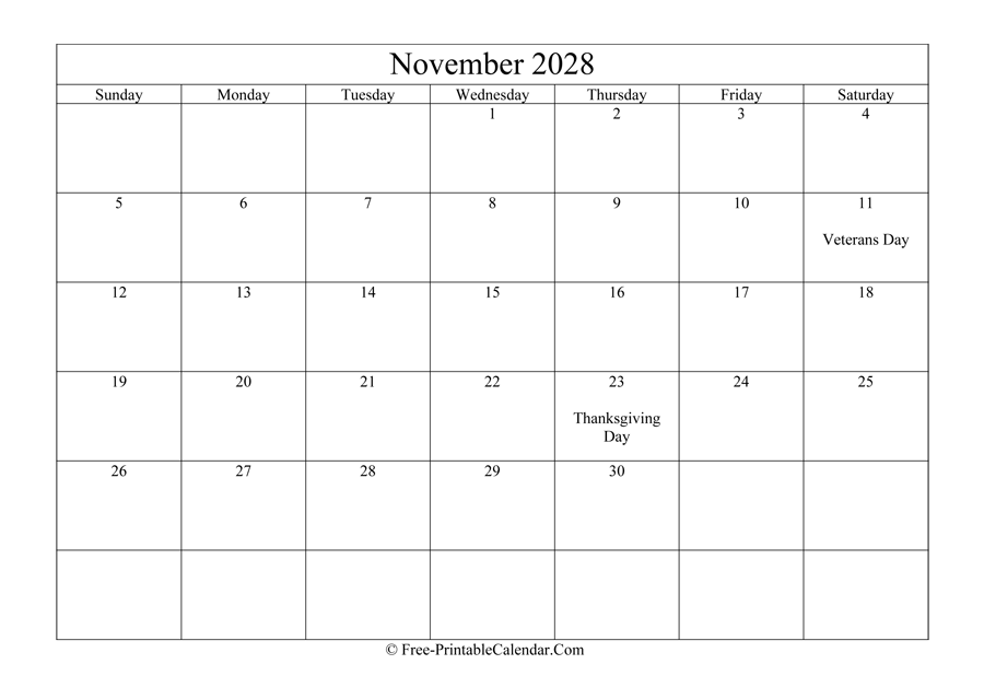 This calendar is free for personal use only and if you think it is useful please link to us. Just copy & paste the following code to your site or blog to share November 2028 Calendar Printable with Holidays.