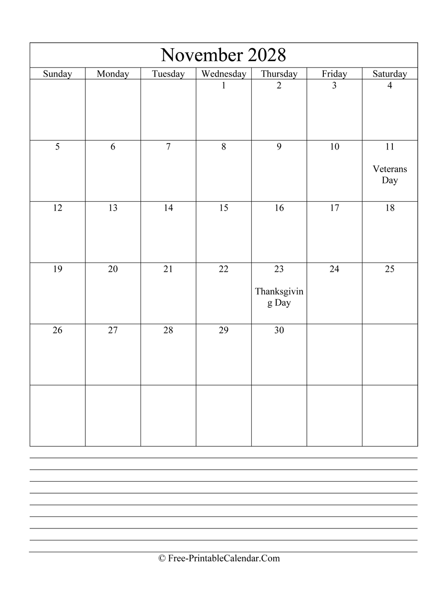 This calendar is free for personal use only and if you think it is useful please link to us. Just copy & paste the following code to your site or blog to share November 2028 Editable Calendar with Notes.