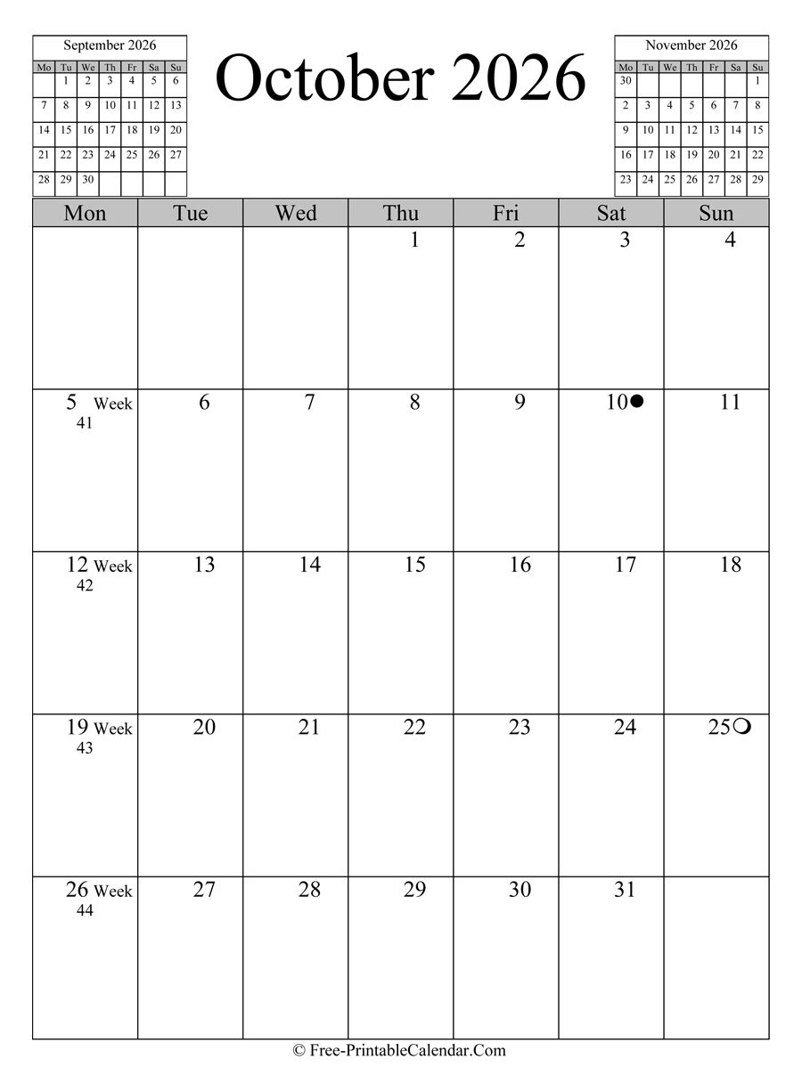 October 2026 Calendar (Vertical Layout) - A portrait calendar for october which included weeknumber, full moon, new moon date and two mini calendars at header. You can download this vertical calendar in Word, PDF or PNG format.