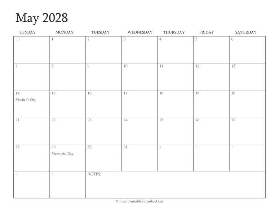 Printable May Calendar 2028 with Holidays - A landscape calendar for may 2028 included us holidays and observances. This calendar can be customize your self with word version available for dowload.