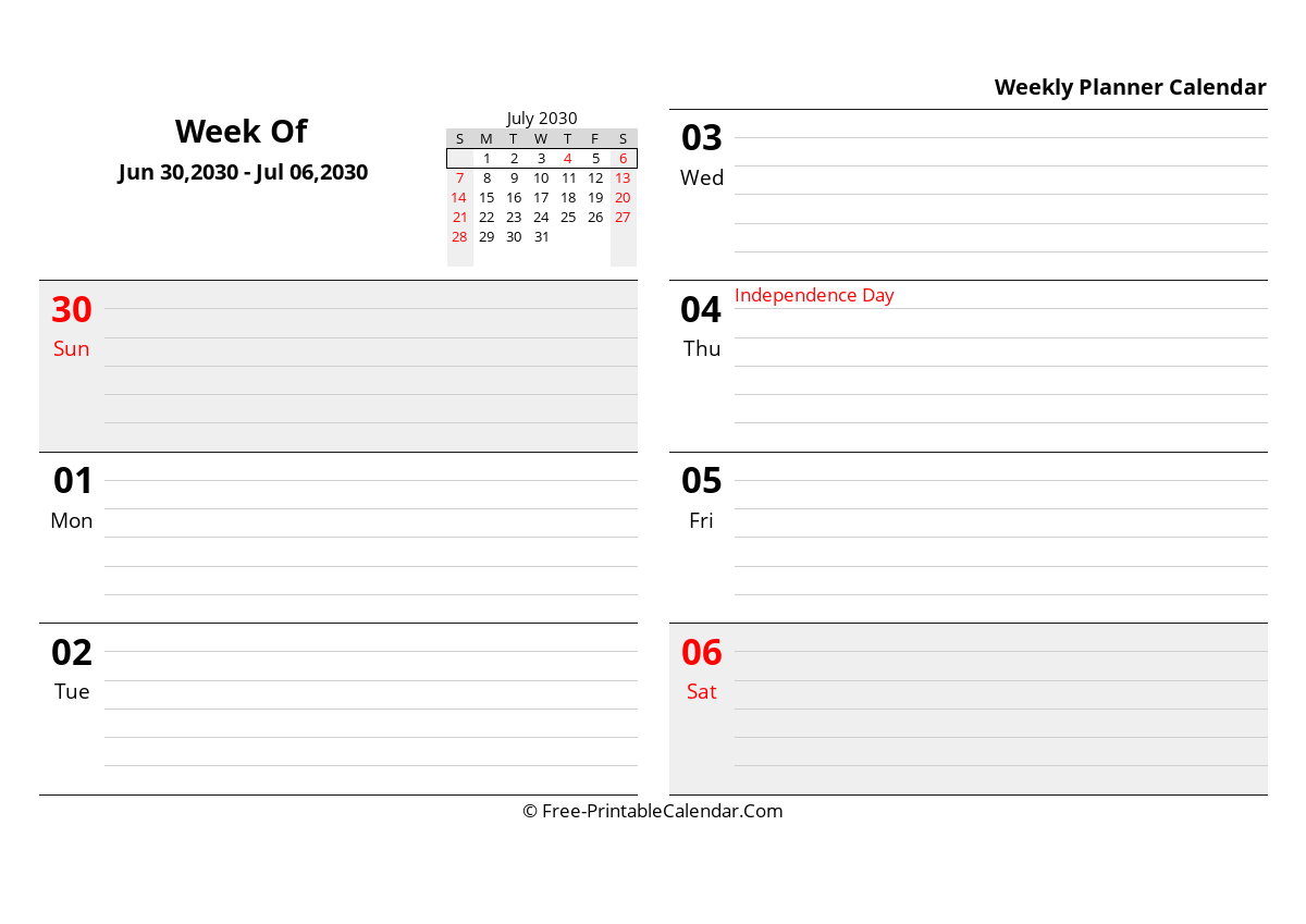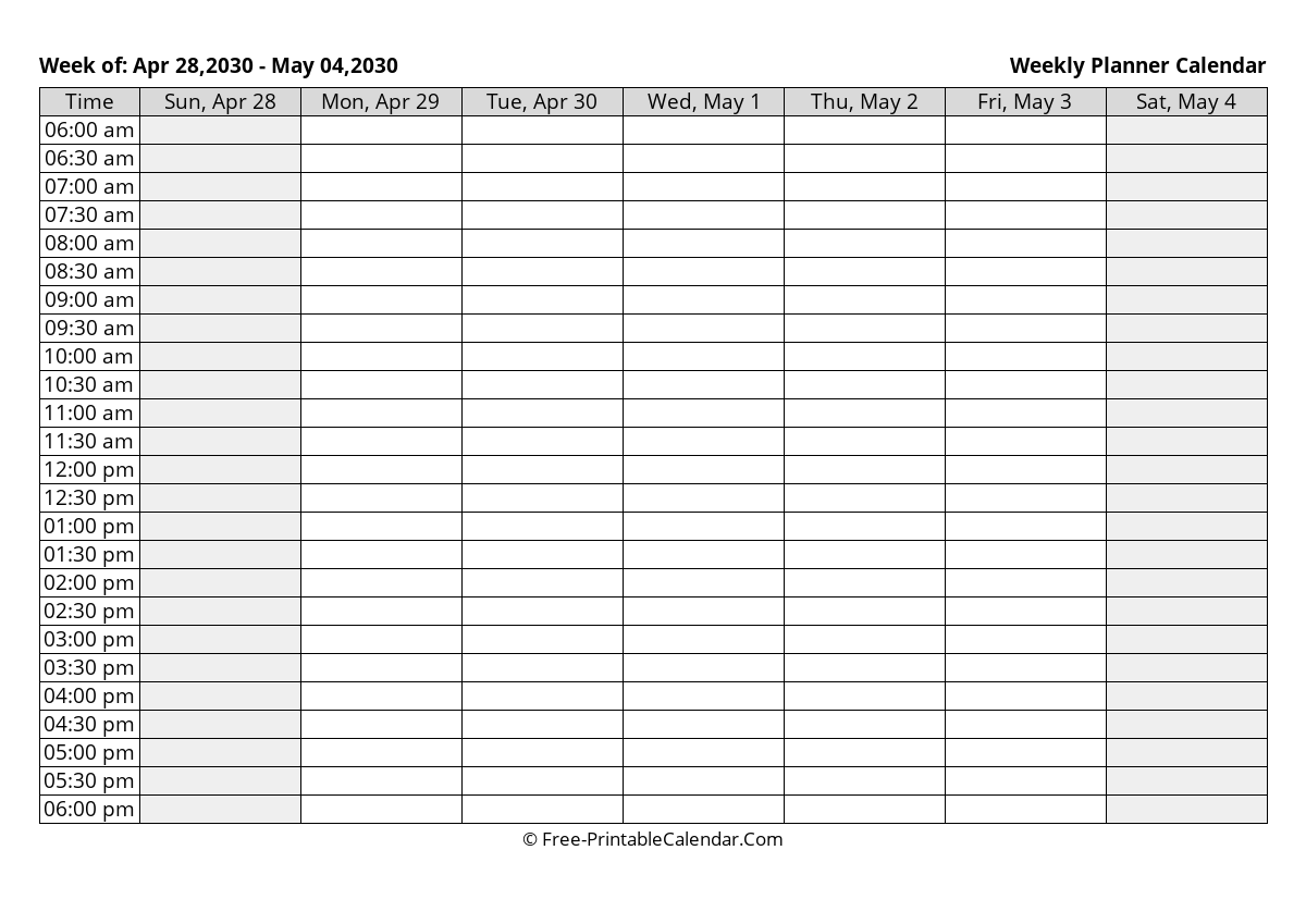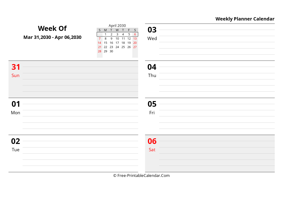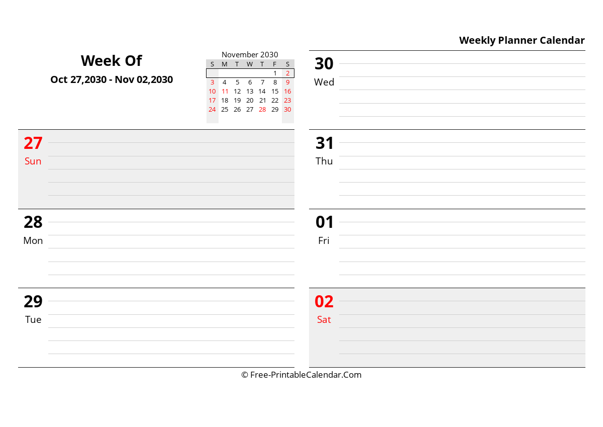 Here you can download free 2030 Weekly Calendar Template in Excel, PDF and Word for any month or any week you like. All weekly calendar templates are available in portrait or landscape layout. We also have calendar with week start on Sunday or Monday.